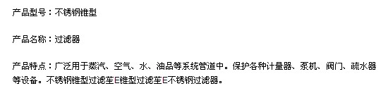 | 產(chǎn)品名稱:不銹鋼錐形過濾器 |
